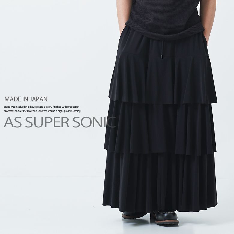 ティアードスカート AS SUPER SONIC / MADE IN JAPAN たっぷりとギャザーを寄せたフリルを3段に施した、軽やかで可憐な雰囲気のモード系スカート。